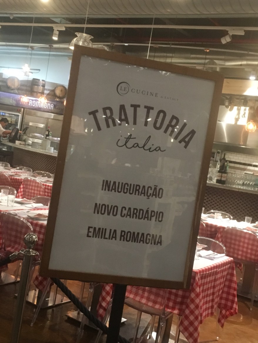 Há cada 3 meses o restaurante Trattoria Italia, do Eataly, renova o cardápio e apresenta novidades aos clientes, sempre homenageando uma cidade da Itália. Já está sendo servido o cardápio feito para homenagear a cidade Emilia Romagna, que traz ingredientes típicos da região como o Prosciutto de Parma, Parmigiano Reggiano e o tão conhecido molho bolognese.