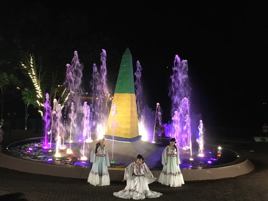 Ainda entre o pôr do sol e as apresentações de dança também foi possível apreciar o espetáculo de luzes que acontece sobre as fontes que envolvem o obelisco.