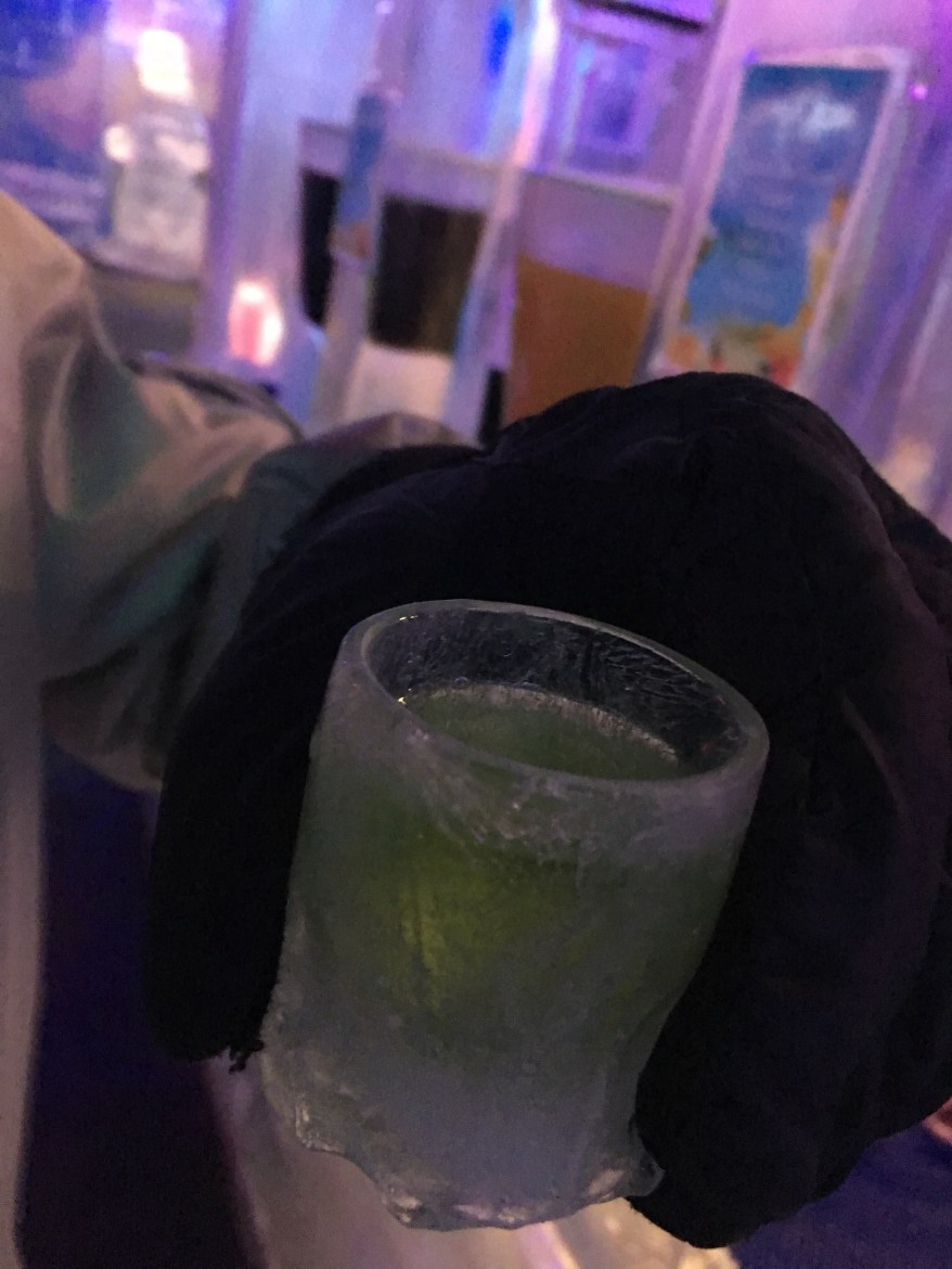 A entrar no bar você veste um casaco térmico e luvas térmicas e permanece 10 minutos na primeira sala de climatização que já é um pouquinho fria e só depois entra no bar que conta com 50 toneladas de gelo. Lá dentro você se depara com várias esculturas: Olaf, Elsa, Darth Vader, e outras.