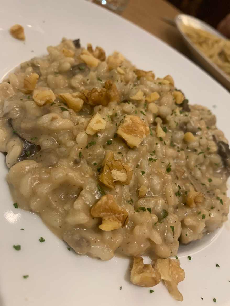 Como prato principal havia três opções e escolhemos duas delas: Spaghetti Carbonara e Risoto di Funghi e Noci.