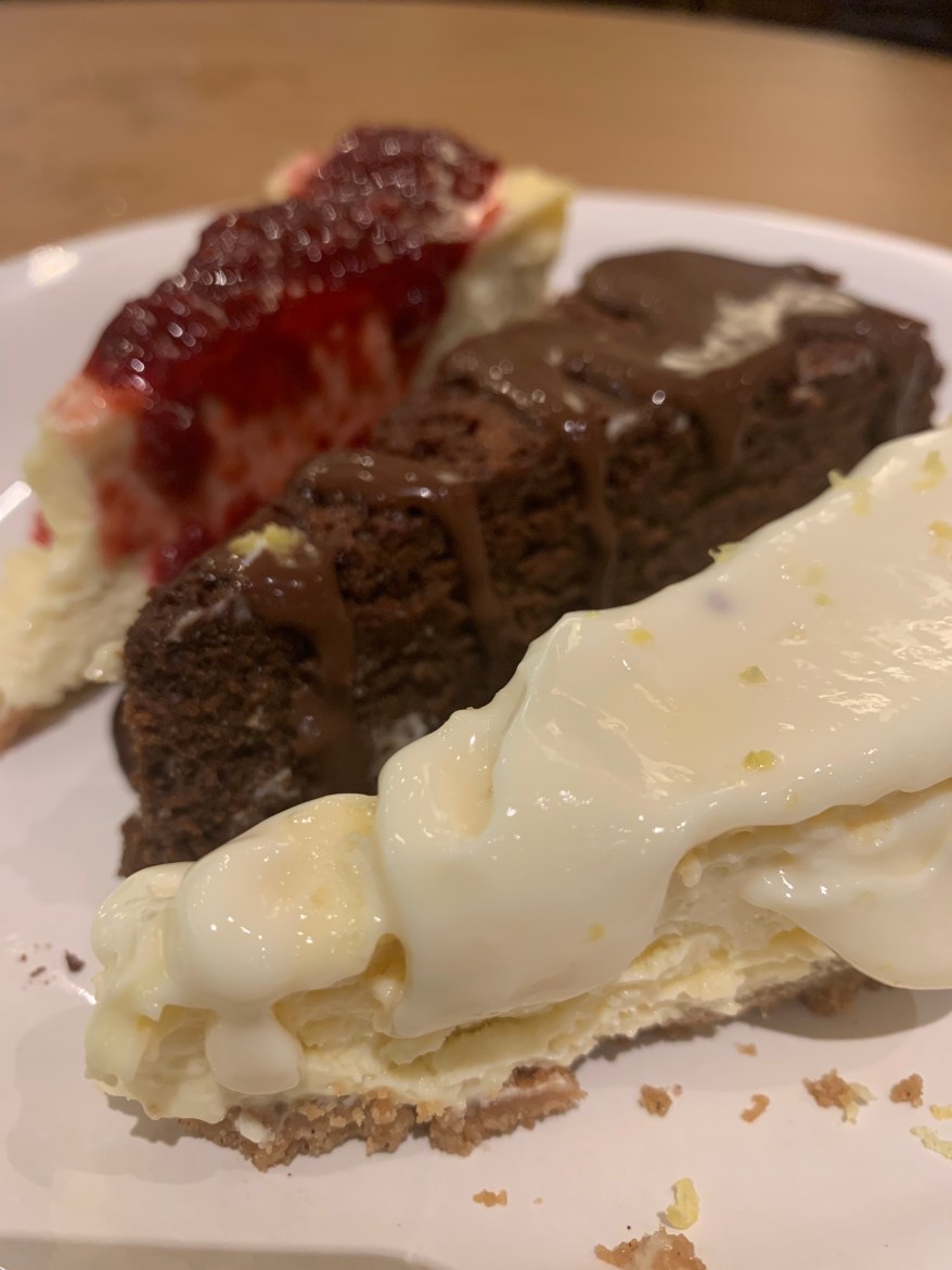E para a sobremesa três opções: cheescake frutas vermelhas, cheescake limão siciliano e torta de chocolate.