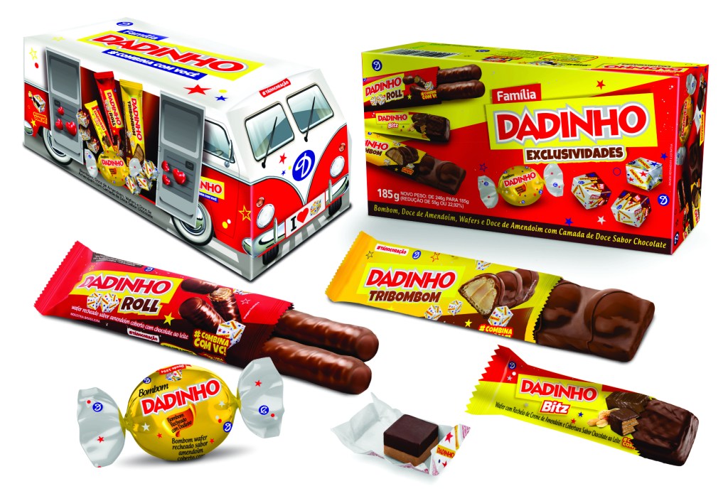 Já o Roll são dois canudos de wafer crocante, recheados com Dadinho e cobertos com chocolate ao leite, e o Tribombom que é uma base de wafer com três bombons recheados de creme de Dadinho e finalizado com a cobertura de chocolate ao leite.