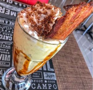 Começando pela loja matriz, que no momento opera com delivery e também com salão, mas com ocupação total reduzida, um dos principais diferenciais da casa preparada com a iguaria é o milk-shake da linha especial preparado com sorvete de creme batido com farofa de bacon artesanal, finalizado com uma fatia da iguaria sequinha e crocante para decoração R$21,90 – 350ml.