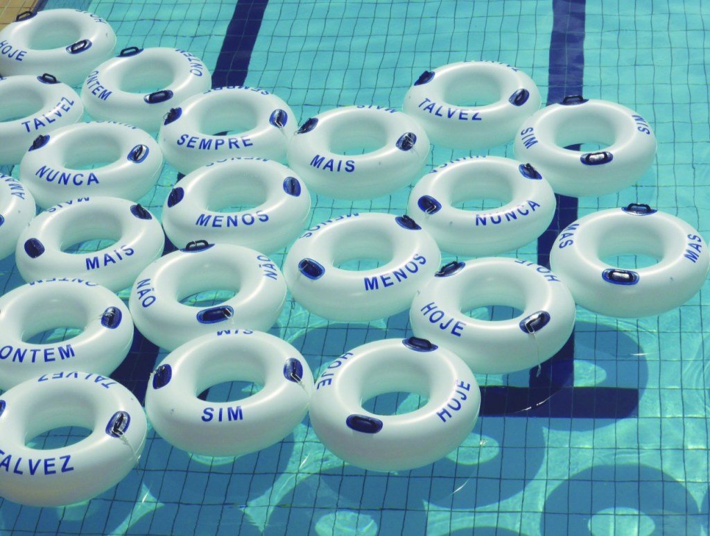 A obra “Em contato”, da artista brasileira Ana Teixeira, foi inicialmente desenvolvida para uma intervenção realizada em piscinas. No MuBE, ela ganha uma nova leitura no espelho d’água do espaço, trazendo a participação do acaso na formação de frases e entendimentos.
