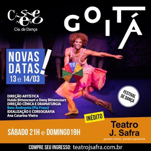 Nos dias 13 e 14 de março, o Teatro J. Safra recebe três apresentações do espetáculo “GOITÁ” – sendo duas apresentações com público presencial e uma apresentação com transmissão online, que conta com direção artística de Hulda Bittencourt e Dany Bittencourt, direção cênica e dramaturgia de Beto Andreetta, da Pia Fraus, idealização e coreografia de Ana Catarina Vieira, assistência de coreografia de Patrícia Alquezar, criação de bonecos de Dino Soto, trilha sonora do Quinteto Violado, com referência especial à Dudu Alves, edição musical de Cesar Maluf, figurinos com criação e concepção de André Santana e Elson Leite (Atelieles) e Balletto. “Glória do Goitá, uma pequena cidade localizada a 60Km de Recife, é hoje em dia, considerada a capital brasileira do Mamulengo e é nossa inspiração e este espetáculo que homenageia e reverencia o universo do Mamulengo Pernambucano.” comenta Hulda, fundadora da Cisne Negro Cia de Dança e também inspiração para a dança nacional.