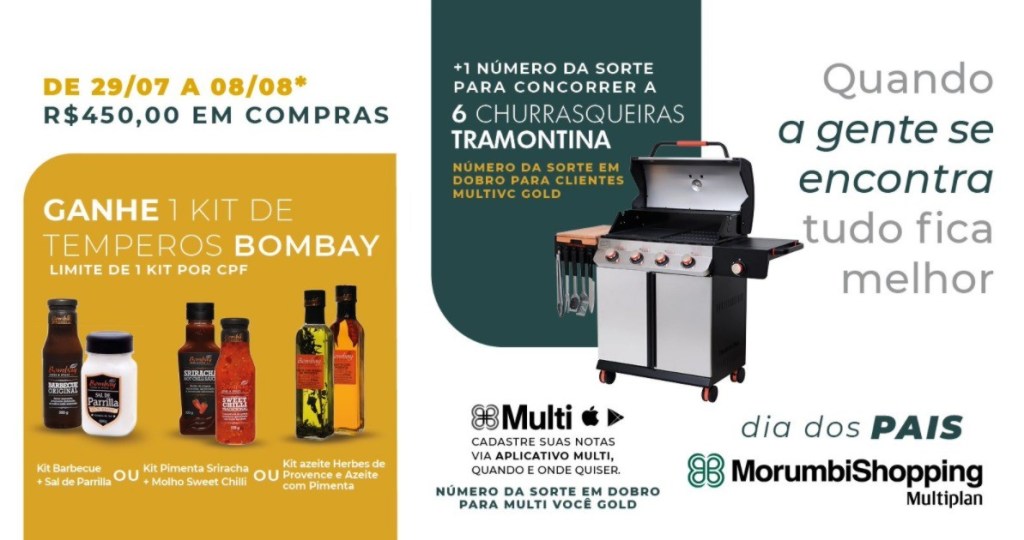 - Morumbi Shopping – A cada R$ 450,00 em compras nas lojas participantes, o cliente ganha 1 kit Bombay (limitado a 1 por CPF e a ação dura até acabar o estoque) e 1 número da sorte para concorrer a 6 churrasqueiras a gás da Tramontina. Dentre os kits temos Barbecue Original 350g + Sal de Parilla 600g ou Pimenta Sriracha 330g + Molho Sweet Chilli 375g ou Azeite Herbes de Provance + Azeite com Pimenta. Para aumentar as chances, os clientes MultiVC Gold ganham cupom em dobro para o sorteio.
