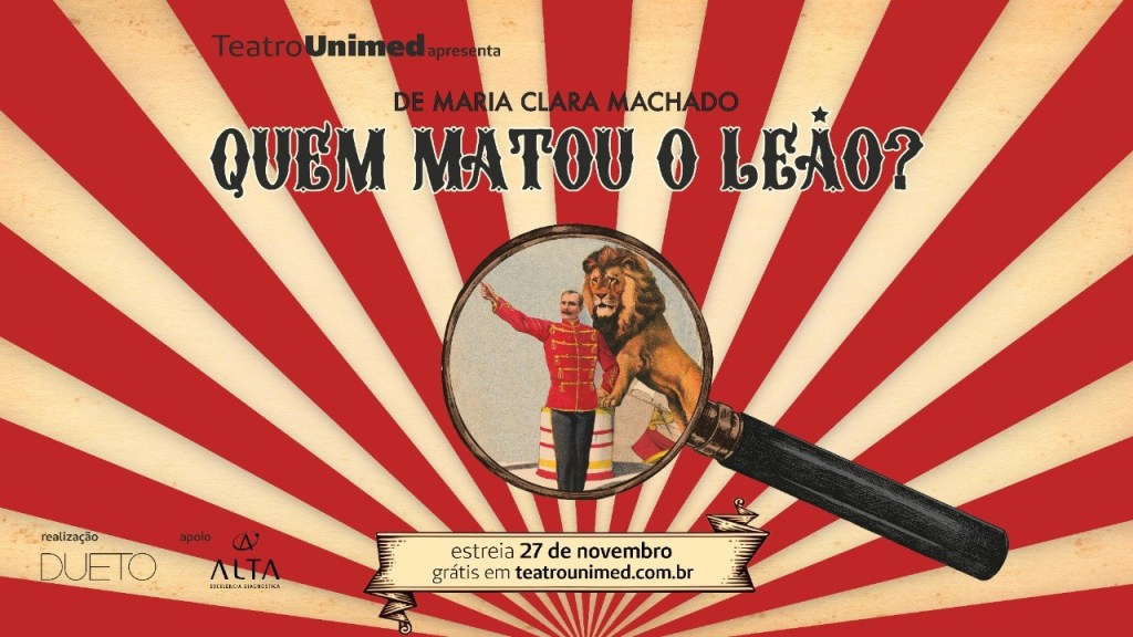 Celebrando os 100 anos de nascimento de Maria Clara Machado e os 70 anos de fundação d’O Tablado, uma nova montagem de um dos clássicos pouco encenados de Maria Clara Machado poderá ser vista, gratuitamente, por todo o Brasil, no site do Teatro Unimed (www.teatrounimed.com.br), a partir do sábado, 27 de novembro, às 16h. Com direção de Susana Ribeiro e Sérgio Dias Maciel e realização da Dueto Produções, a peça infantil Quem Matou o leão? é dividida em quatro episódios, que estreiam aos sábados e domingos, sempre no mesmo horário (16h). O espetáculo completo poderá ser visto até o dia 16 de janeiro de 2022, sendo uma excelente opção de lazer para as crianças no período de férias escolares. Esta nova e muito divertida produção do Teatro Unimed leva para crianças de todo o Brasil (e do mundo!) a indispensável obra de Maria Clara Machado, escritora que dedicou sua vida ao teatro e que jamais subestimou a inteligência singular da infância. Suas peças, com estilos diversos, sempre contam histórias divertidas e amorosas, apresentando conteúdo poético e humanístico. O ano de 2021 marca também os 20 anos de morte da autora.