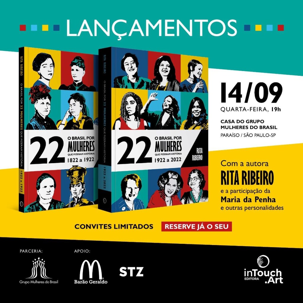 O evento acontece no dia 14 de setembro a partir das 19h, na Casa do Grupo Mulheres do Brasil – R. Dr. Tomás Carvalhal, 681 – Paraíso, São Paulo, e as vagas são limitadas. Para mais informações sobre o evento acesse o site: https://www.sympla.com.br/evento/o-brasil-por-22-mulheres-que-fizeram-historia-de-rita-riberio-lancamento-oficial/1672341