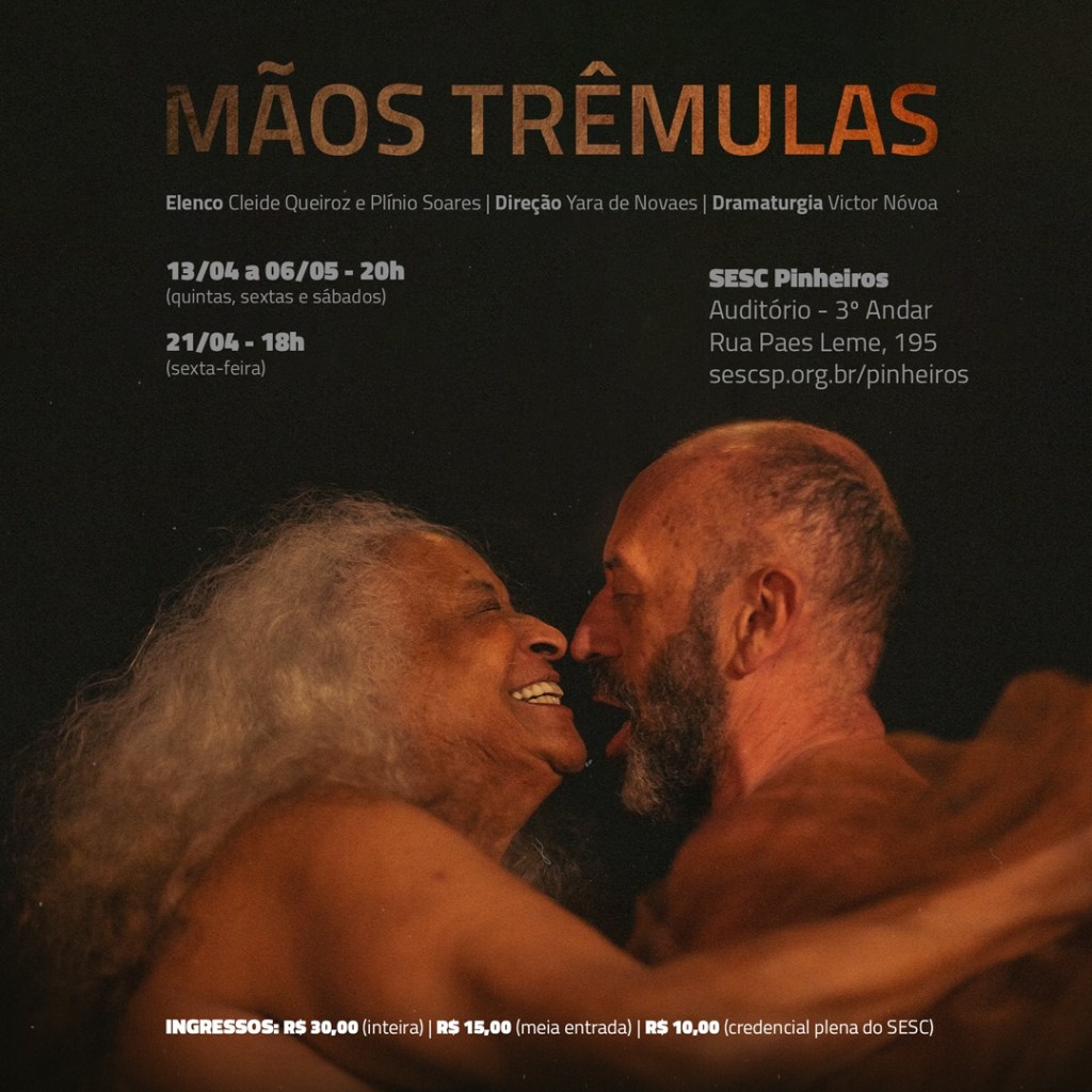 Envelhecer no Brasil é um processo que pode ser doloroso, com enfrentamento de preconceitos, dificuldades financeiras e da busca pelo aplacar da solidão. Esses são alguns dos temas para os quais o dramaturgo Victor Nóvoa olha em seu novo espetáculo, Mãos Trêmulas. Com direção de Yara de Novaes, a peça estreia em 13 de abril no Sesc Pinheiros e fica em cartaz até 6 de maio, com sessões de quinta a sábado.