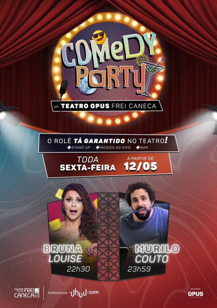 A partir de maio, o Teatro Opus Frei Caneca lança o ‘Comedy Party’ com shows de Bruna Louise (às 22h30) e Murilo Couto (às 23h59). Nesta noite da comédia, o foyer do teatro se tornará uma verdadeira balada com DJ e drinks antes, durante e após as apresentações dos comediantes.