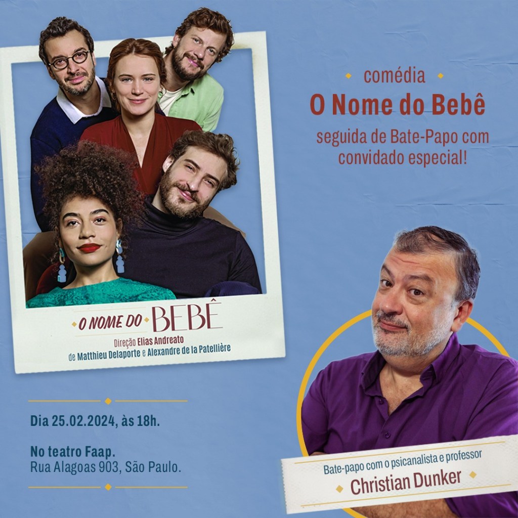 Christian Dunker participa de um bate-papo com o público após o espetáculo O Nome do Bebê, no Teatro Faap, no domingo, 25 de fevereiro. O O psicanalista discutirá o comportamento nas relações íntimas, tema tratado na comédia, que vem tendo grande sucesso de público. A intermediação será do jornalista Dennis Nascimento.