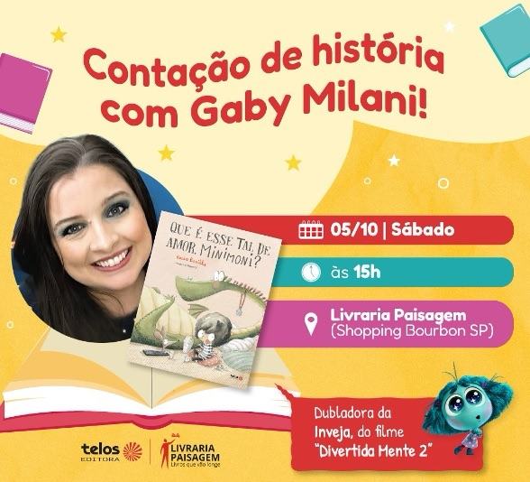 A cantora e dubladora Gaby Milani, nacionalmente conhecida por dar voz a personagem “Inveja” de “Divertida Mente 2”, irá contar e encantar o público com maravilhosas histórias infantis neste sábado, dia 5. A atividade é gratuita e será realizada na Livraria Paisagem, em parceria com a Telos Editora, a partir das 15h, no Bourbon Shopping, zona oeste da capital paulista.