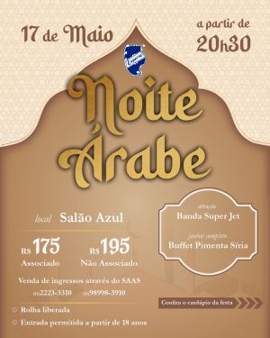 O Clube Esperia realiza no sábado, dia 17 de maio, a partir das 20h30, a Noite Árabe, evento que promete envolver os convidados com os sabores e a musicalidade do Oriente Médio. Realizada no tradicional Salão Azul, a festa é voltada para o público adulto (acima de 18 anos) e será embalada pela Banda Super Jet, que garante uma noite animada e cheia de energia.