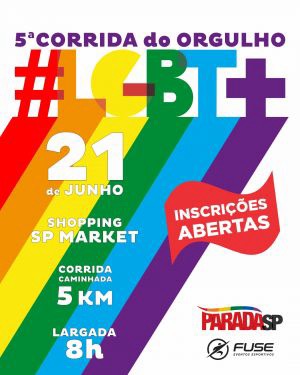 As inscrições para a 5ª edição estão abertas e podem ser feitas no site www.corridaorgulho.com.br. O evento acontece no dia 21 de junho, sábado, no Shopping SP Market, das 6h às 10h30, com largada às 8h, em um percurso de 5 km de corrida ou caminhada, passando pelo complexo do shopping, incluindo mall, estacionamentos, e o Parque da Mônica. A programação cultural e artística do evento será incrível, com atrações exclusivas e com muita animação.