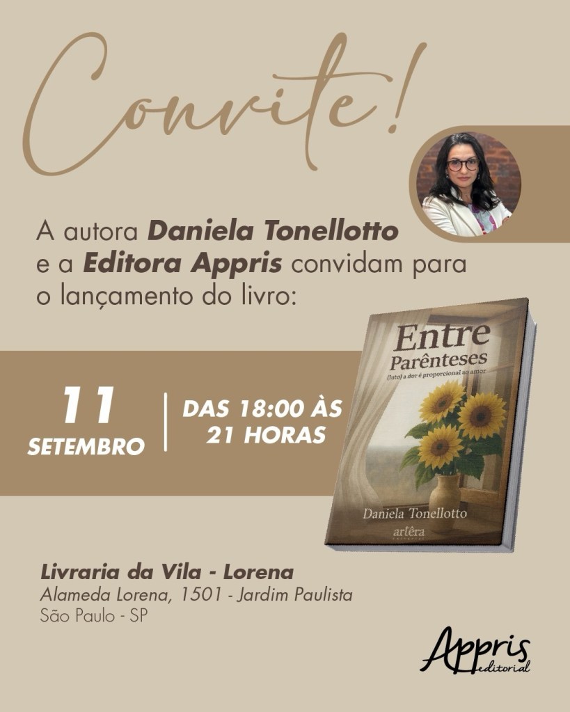Na agenda de eventos dessa semana, Daniela Tonellotto está lançando o seu primeiro livro Entre parênteses(luto) A dor é proporcional ao amor (Appris / Artêra, 128 p., R$ 46,00), obra em que a autora convida a mergulhar nas profundezas de uma dor inimaginável: a perda de um filho. O livro não é sobre “superar” o luto, mas sobre aprender a viver com ele, a reconhecê-lo como parte de nós, sem que ele apague o amor que permanece. O lançamento acontece não por acaso durante o Setembro Amarelo, mês da campanha de prevenção ao suicídio e também quando seria celebrado o aniversário do jovem Andreus. A noite de autógrafos será na Livraria da Vila – Unidade Lorena (Al. Lorena, 1.501 – Jd. Paulista – São Paulo – SP), dia 11/09 – quinta-feira, a partir das 18h. Favor confirmar presença pelo link: https://entreparenteses.com.br/confirmacao-de-presenca/