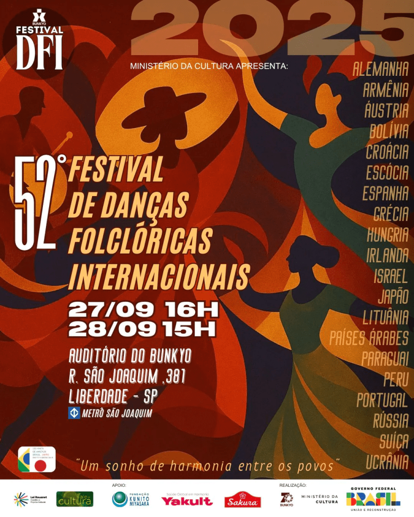 O Bunkyo – Sociedade Brasileira de Cultura Japonesa e de Assistência Social – realiza a 52ª edição do Festival de Danças Folclóricas Internacionais, que acontece nos dias 27 de setembro (sábado), às 16h, e 28 de setembro(domingo), às 15h, no Grande Auditório da entidade, no bairro da Liberdade.
