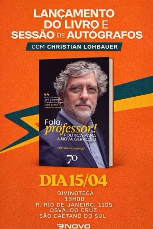O livro Fala, professor! Política para a nova geração, de Christian Lohbauer, chega às livrarias de todo país com a proposta de falar diretamente aos jovens sobre os fundamentos da política e os desafios institucionais do Brasil. O lançamento em São Caetano do Sul (SP) ocorre no dia 15 de abril, às 19h, na Divinoteca, com bate-papo com o autor, sessão de autógrafos e reflexões sobre vida pública e sociedade.